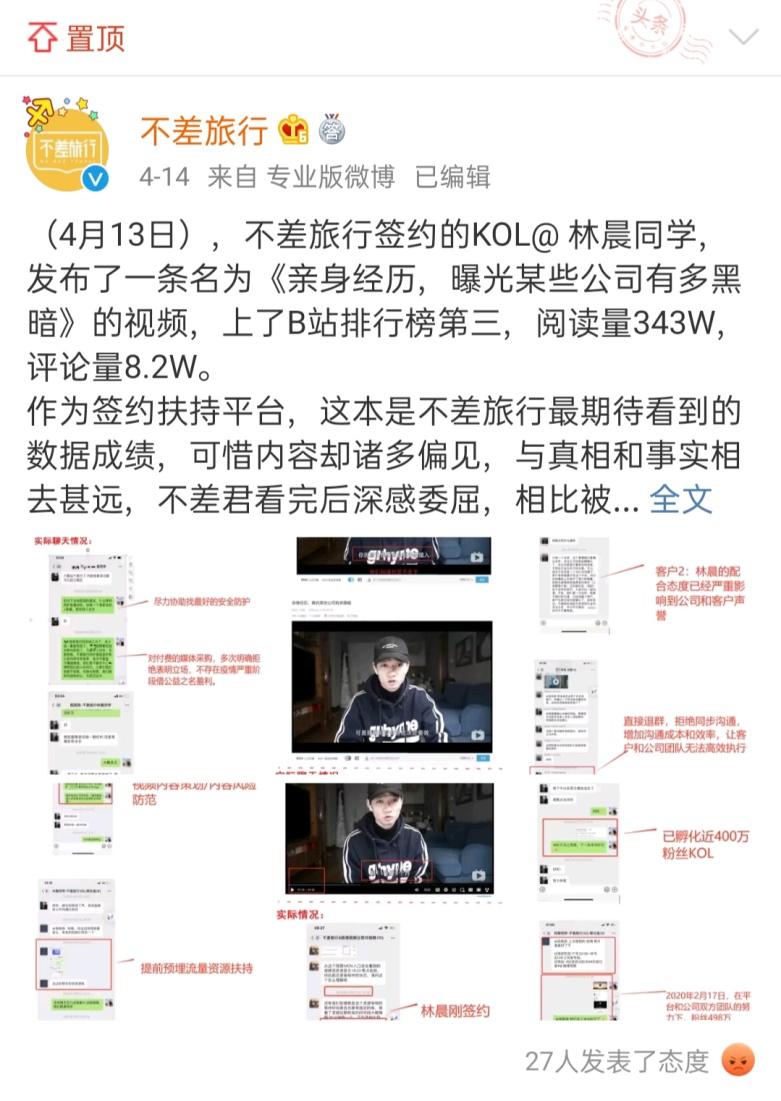 4月14日,与林晨签署合约的MCN机构“不差旅行”,在微博回应林晨的声讨。该声明表示,林晨视频所述“与真相和事实相去甚远”,并同时公布大量聊天截图,分条澄清维权视频中提及的问题,声称“不存在疫情严重阶段借公益之名盈利”、“保护旗下KOL,安全永远为第一位”、“孵化群团队专人分工对接扶持”等,并指出林晨“已经严重影响公司声誉”的违约行为。“不差旅行”创始人曹进则在此前接受媒体采访时,表示“有苦说不出”,将双方冲突解读为“契约精神”的缺乏。