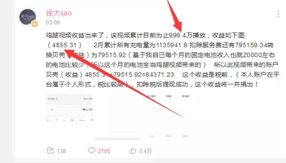 3月6日,徐大sao首次公布鸡腿视频收益:999.4万播放量,(激励)收益为4855.31元。2月累计所有充电量为1135941.9元,扣除服务费还有795159.34元。