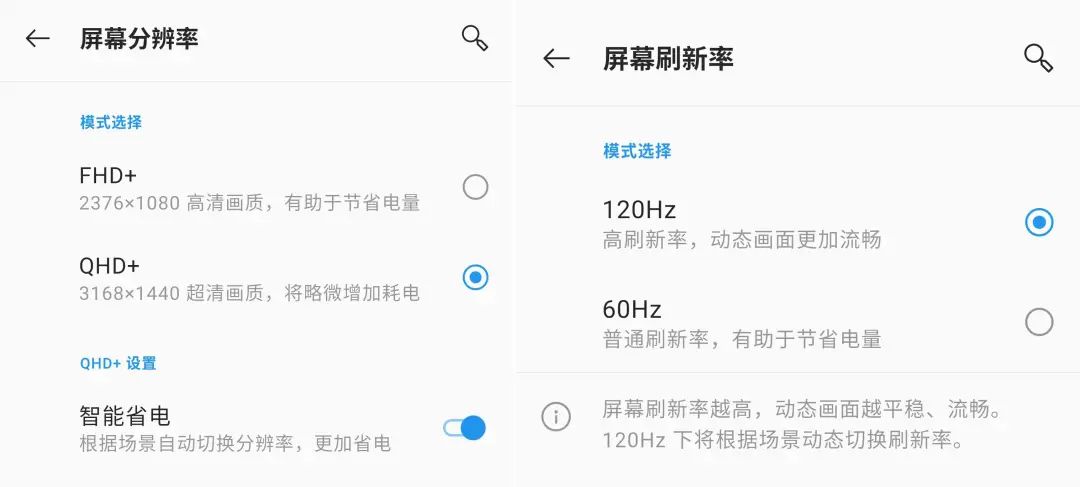 开启「智能省电」后,系统会自动在 FHD+ 和 QHD+ 分辨率之间切换