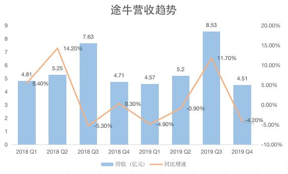 根据途牛财报,途牛第四季度营收4.51亿元(人民币,下同),同比下降4.2%。2019年全年,途牛营收23亿元,同比增长仅1.8%。
