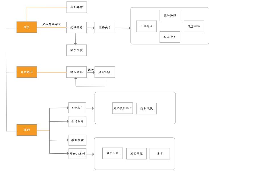 下面我们简要分析扇贝编程的产品功能结构和用户使用流程。从产品的功能结构来看,扇贝编程app首页的底部有三个按键,分别对应产品的三大功能。在首页学员点击“开始学习”进入课程目录,选择想要学习的内容后需要完成四大学习环节:“互动讲解”、“随堂测验”、“知识卡片”和“上机作业”;“代码集市”提供代码的运行环境,编写好的代码在这里展示运行结果。