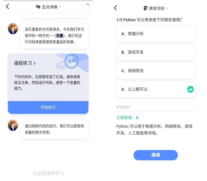用户在空闲时间打开已购买课程,学习编程知识;这一部分的页面提供文字和图片知识点讲解,编程配套练习,学习进度反馈,互动式内容呈现的功能。
