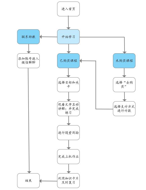 这里我们将用户选择开始学习后的使用流程详细拆解。可以看出学习已购买课程的流程是直接清晰的,通过跳转付费页面产品增加了用户接触付费窗口的概率。最后,联系助教的选项扩充了产品的私域流量池。