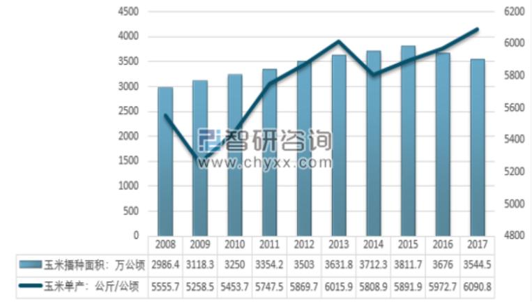 ▲2008-2017年我国玉米播种面积及单产情况(资料来源:国家统计局 智研咨询)