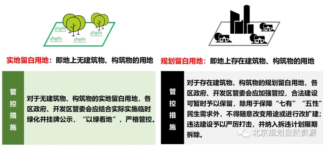 各区政府、开发区管委会应加强战略留白用地管理,2035年前保持总量不减少。鼓励各区政府、开发区管委会增加战略留白用地规模,将“疏解整治促提升”专项行动腾退等用地中短期内无明确实施计划的地块,及时划入战略留白用地。