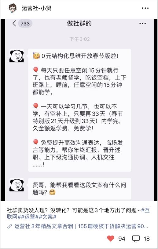 在我们《社群文案3个常见问题》这条视频中,我们用一个案例,讲解了社群文案的常见问题。但是,有用户反馈,虽然学到了干货,但视频给到的案例没能看清,信息量太大。