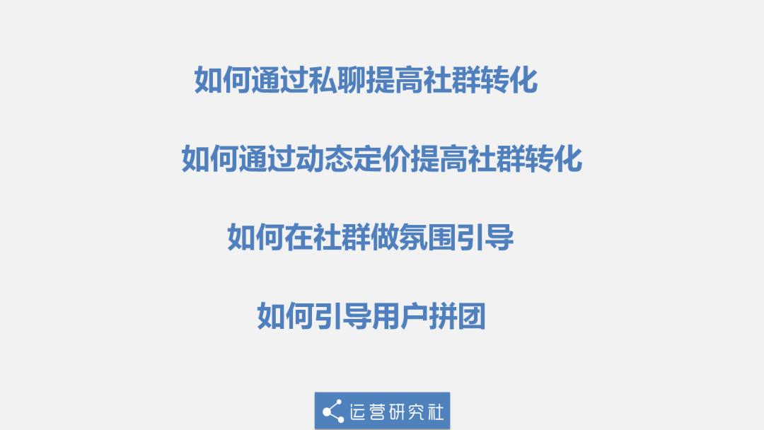 这个选题的正确打开方式应该是拆解成 4 条视频,分别是:如何通过私聊提高社群转化,如何在社群做氛围引导,如何通过动态定价提高社群转化和如何引导用户拼团。