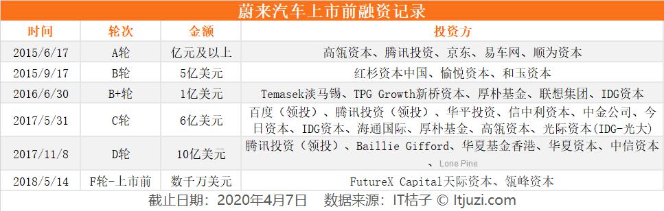 2018 年 9 月 12 日,蔚来汽车在美国证券交易所挂牌上市,正式登陆资本市场。在其登录纽交所之前,蔚来汽车真正意义上仅发布了一款汽车。此外,在其成立 4 年的时间里,大众听到最多的消息则是其不断的进行融资。IT 桔子数据显示,上市之前蔚来汽车密集完成了 6 轮融资。
