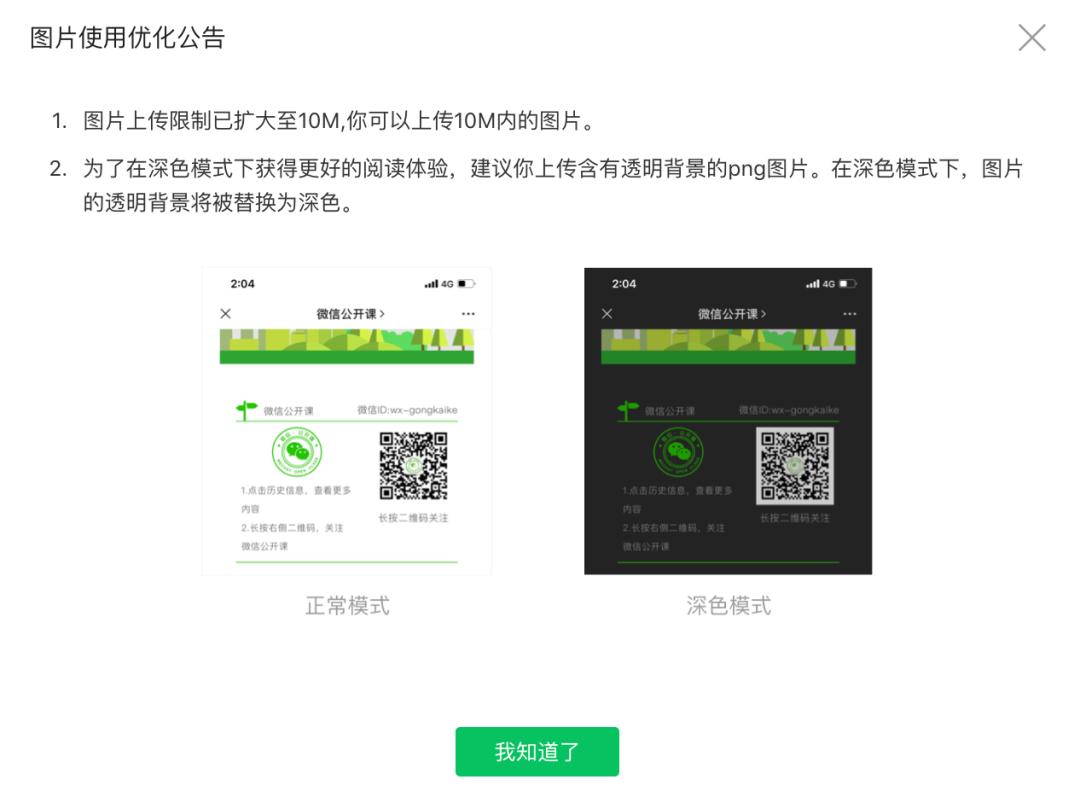而且还特别提示了深色模式下阅读体验的问题,因为深色模式下,图片的底图背景是能显示的。