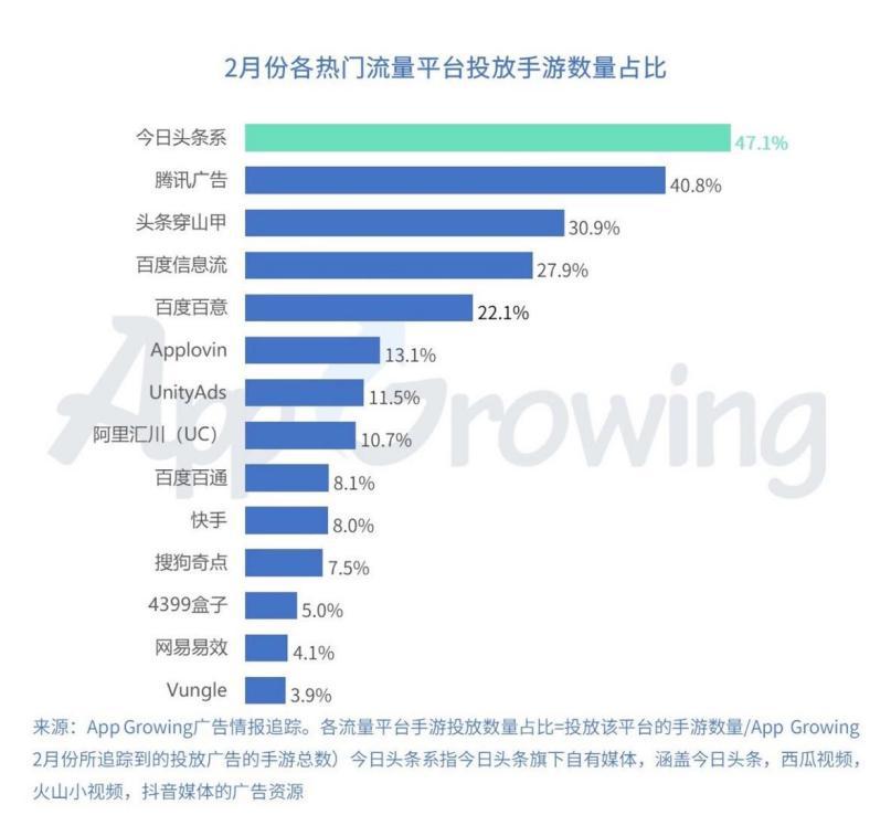 根据App Growing此前发布的2019年2月各热门流量平台投放手游数量占比,有47.1%的手游在进行广告投放时选择了今日头条系,如果算上排在第三的头条穿山甲与之非重合广告主,数量可能会更多。