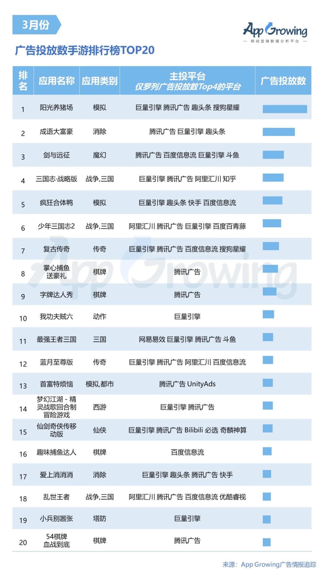 App Growing发布的今年3月广告投放数手游排行榜top 20中,出现频率最高的是腾讯广告和巨量引擎,榜单上还有的是快手、斗鱼、知乎等腾讯系公司。