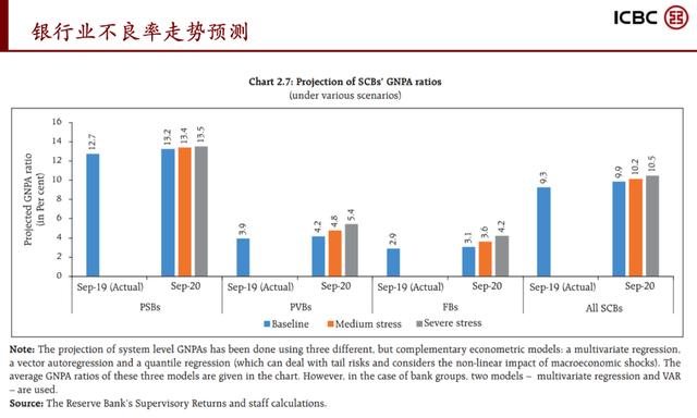 这张图是对接下来的印度行银行业的不良的预测,大家可以看到,它的左边蓝色柱子是他现在最新一期的报告里的数字,右边的是对它2020到2021财年的预测。它分成三种不同的假设条件,但即便是最理想的baseline(基准)的假设条件下,整个不良率都会继续上升。