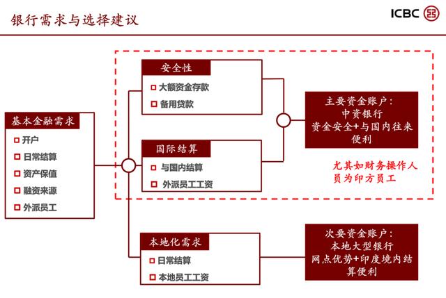本地可能会有一些个性化的需求。那么就会在本地再开一家银行。至于本地的银行怎么选择,我做下一页会跟大家简单说一下。有些客户跟我们来说,“我们这边没有什么人,基本上都是印度人在负责财务工作,所以我们开在中资银行或者开在外资银行,印度人觉得不太方便”,我倒觉得,尤其这种情况,大家还是要选中资银行,至少要选一家外资银行。