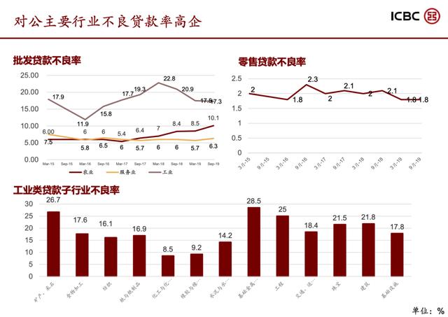 这是几个分类的不良率,左边上面这张图里有一个批发贷款的不良率。批发贷款不良率分成第一、第二、第三产业,大家可以看到其实最高的是工业,第二产业的不良率,平均达到17.3%;农业的平均不良率过去几个季度在不停的上升,现在是到10.1%;服务业相对来说低一点6.4%。批发贷款(整体)不良率的水平是非常高的。
