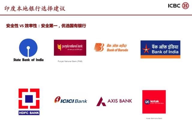 本地银行的选择,我这边列了8家银行,是我们工商银行现在在合作的8家银行。上面4家是国有银行,下面4家是私有银行。如果说你要从安全性角度上来说,我还是强烈建议大家考虑国有银行。因为从现在的实际情况上来看,不管怎么样,国有银行在印度现在不至于出问题,或者说即便出问题,印度政府一定会出手救的。私有银行,包括这次出事的YES Bank也是私有银行。到目前为止,印度的银行、印度央行和印度中央政府还是出手救的。但是如果这个事情不断进行下去的话,很难说他们哪一天就会停。