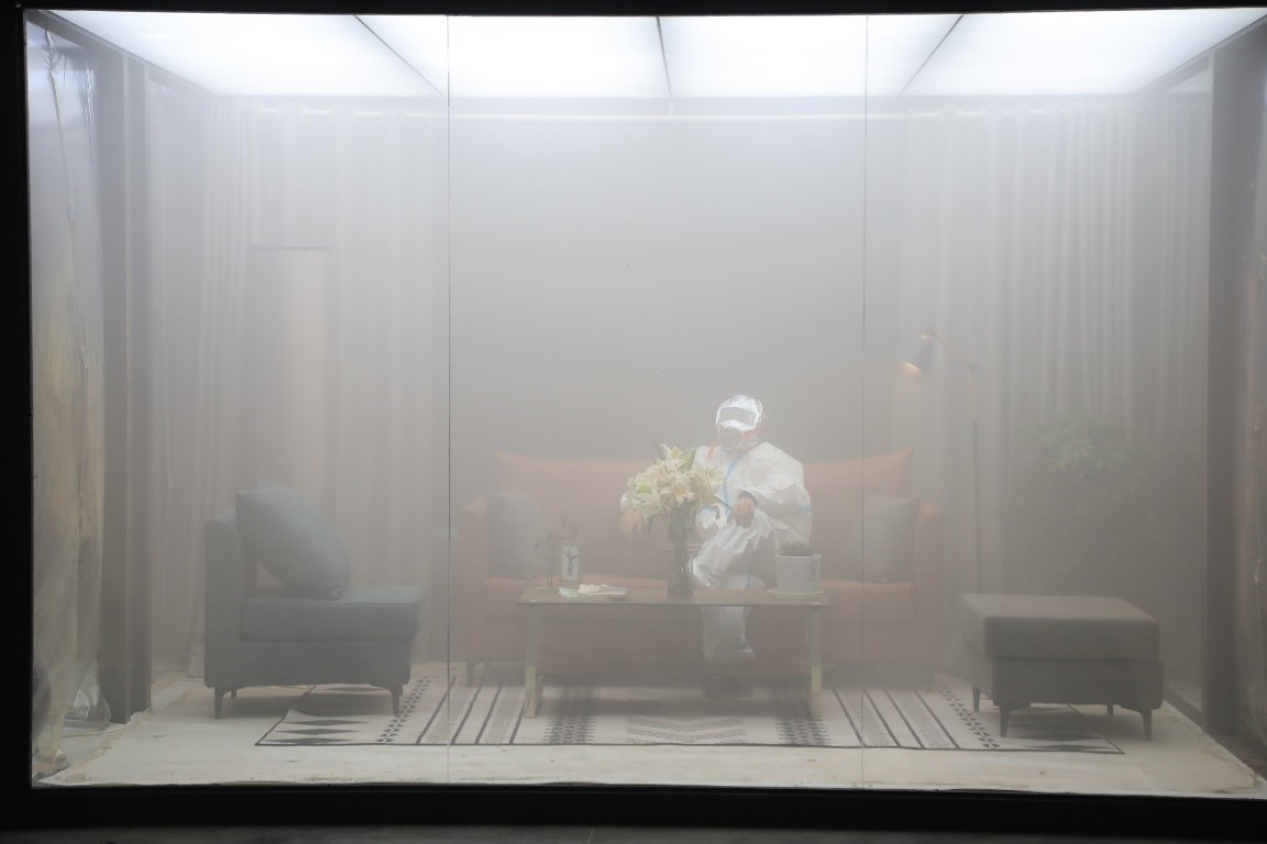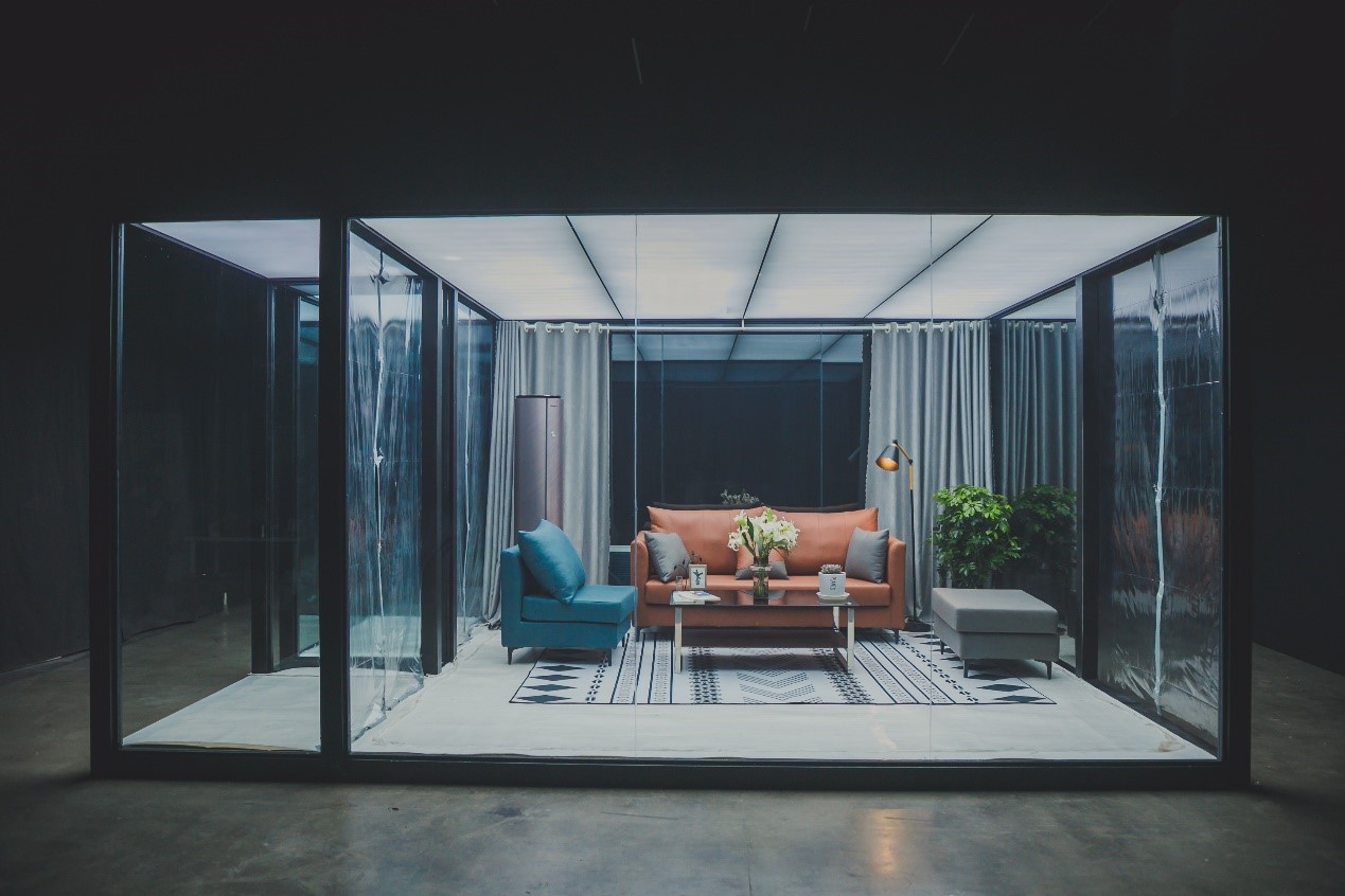 在测试中,海信空调副总裁王宏伟身着防护服进入一间经过火锅、焚烧、烟花污染,已经伸手不见五指的20平方米玻璃房,然后开启海信新风空调X630新风功能。空调开启后,屋内污染空气肉眼可见地被从门缝、窗缝挤出,2分钟后已经房内可以开始正常看书,当时间定格在3分钟,房内空气已洁净如新,王宏伟也脱下防护服,从玻璃房走出步入会场。