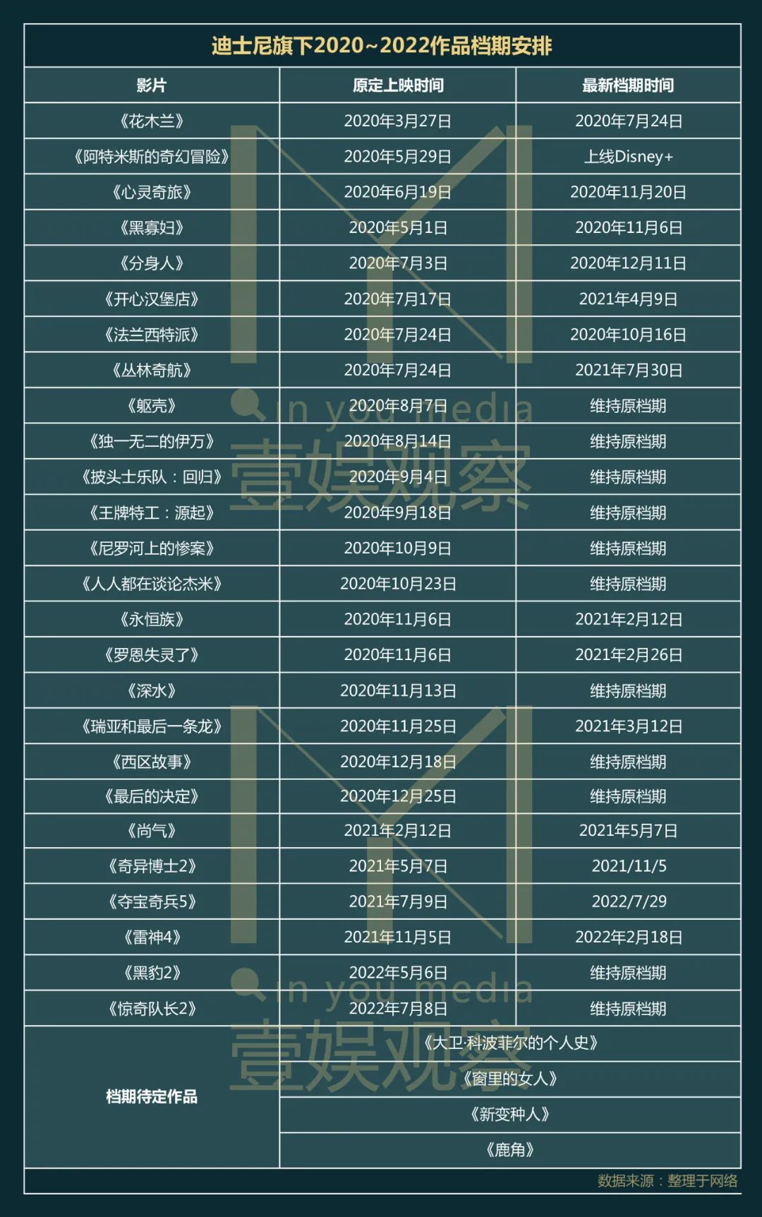 壹娱观察(ID:yiyuguancha)整理了迪士尼旗下近30部作品档期安排表,通过图表可以看出,迪士尼7月份之前的作品全部更改档期。头部作品《花木兰》《黑寡妇》《永恒族》《奇异博士2》《雷神4》都有3~6个月的档期延迟,以规避自身之间档期冲撞。《夺宝奇兵5》更是有一年多的缓冲期。