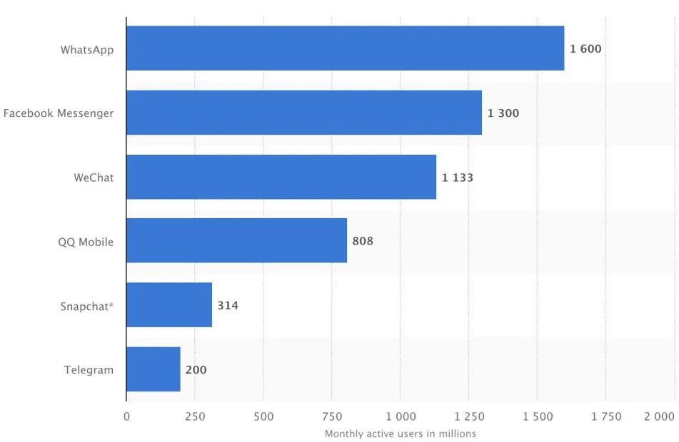 就在刚过去的2020年2月,whatsapp宣布全球用户量突破20亿大关,同时以16亿月活用户(MAU),在全球IM即时通讯软件市场持续领跑。