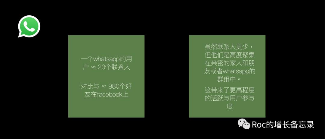 扎克伯克早期推荐facebook员工入职后的必看的书籍《病毒循环》中定义过:病毒循环,就是把产品的病毒性和功能性相结合。whatsapp在没有借助传统广告或营销手段的情况下,利用产品本身的病毒性「build to go viral」,就建立了庞大的用户群。