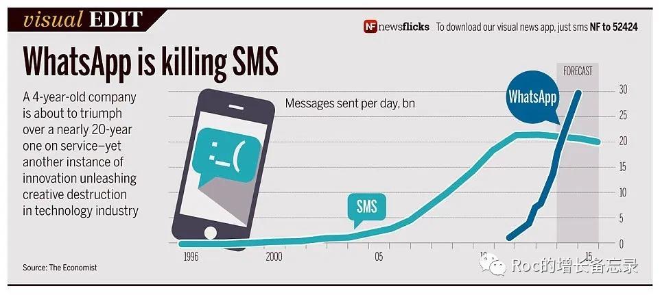 1.facebook的增速度已经极快,符合meltcalfe's law,网络价值的变化是一条幂增长曲线,但是whatsapp背后是一条指数级增长曲线,符合Reed's law,按照正常发展,虽然whatsapp前面有一段缓慢的爬坡期,但一旦迎来拐点,将会一骑绝尘,甩开所有其他对手,哪怕facebook当时的用户基数比whatsapp大,也是面临的巨大的危险。