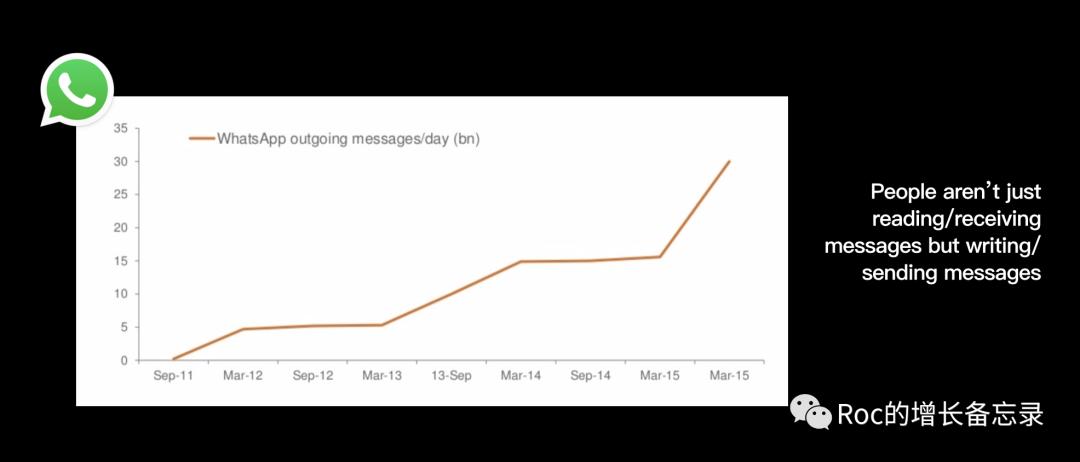多节点连接群组的信息收发体量是远远大过于双人连接。作为体现即时通信软件的Engagement,同时能够衡量whatsapp价值的「核心动作」core action,以及整个业务的「北极星指标」north star metric,就是sends,即信息的发送量。下图是11年到15年whatsapp信息总发送量的变化。