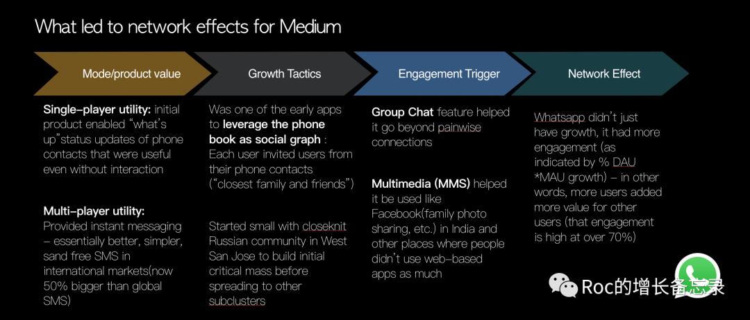 我们还是四步来看看whatsapp实现网络效应的过程,第一步产品模式的初始价值,第二步初始的增长策略,第三步持续提升用户的参与度突破临界值,第四步形成网络效应。
