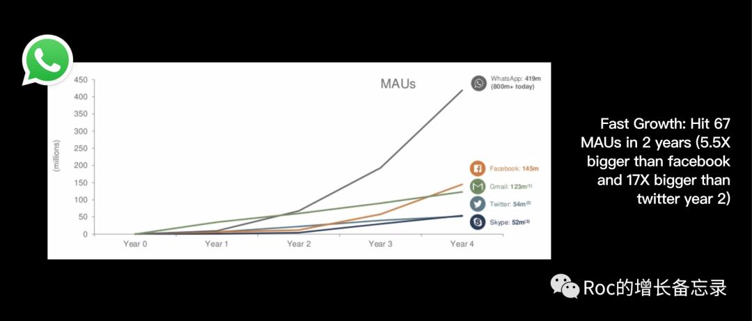 whatsapp在两年内惊人的达到了6700万MAU月活用户,分别是前辈facebook和twitter在第二年时候的5.5倍和17倍。