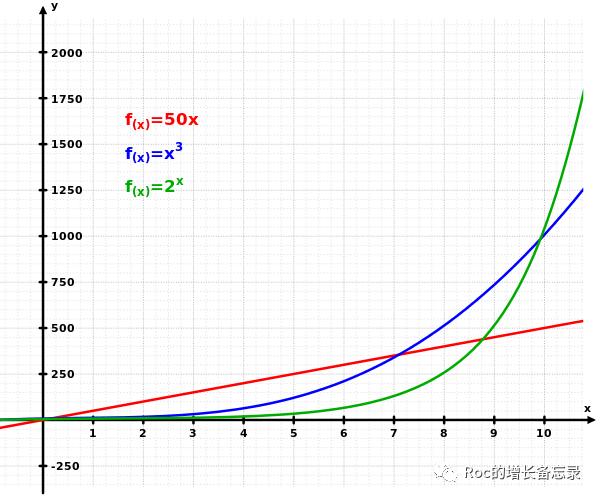 指数级增长(绿色) vs 幂增长(蓝色)