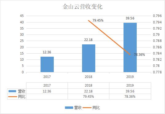 招股书显示,金山云2017-2019年的总营收分别为12.36、22.18、39.56亿元(人民币,下同),维持较高的同比增速。