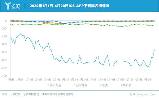 七麦数据显示,2020年1月1日-4月20日,IOS APP 下载排名榜单中,拼多多、淘宝排名稳定在1前十以内,苏宁易购在与阿里合作后线上转型这块也获得了一定的优异成绩,相比来看国美的APP下载量长期徘徊在400名以外,始终未能进入线上的圈子。