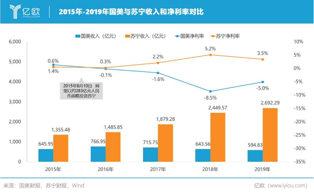 而苏宁易购2019年全年营业收入2692.29亿元,净利率为3.5%,从2015年8月10日阿里宣布战略入股苏宁之后,苏宁净利率不断提升。