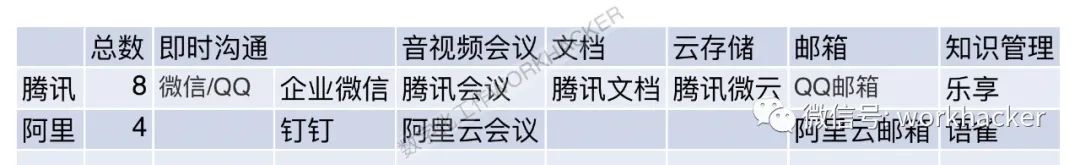 阿里云会议的推出丰富了阿里此前过于单一的产品布局。此前,我们在数字化办公入口的文章中专门分析到,相对于腾讯的数字化办公产品矩阵,阿里的产品比较单一,过于依赖钉钉这一单品。