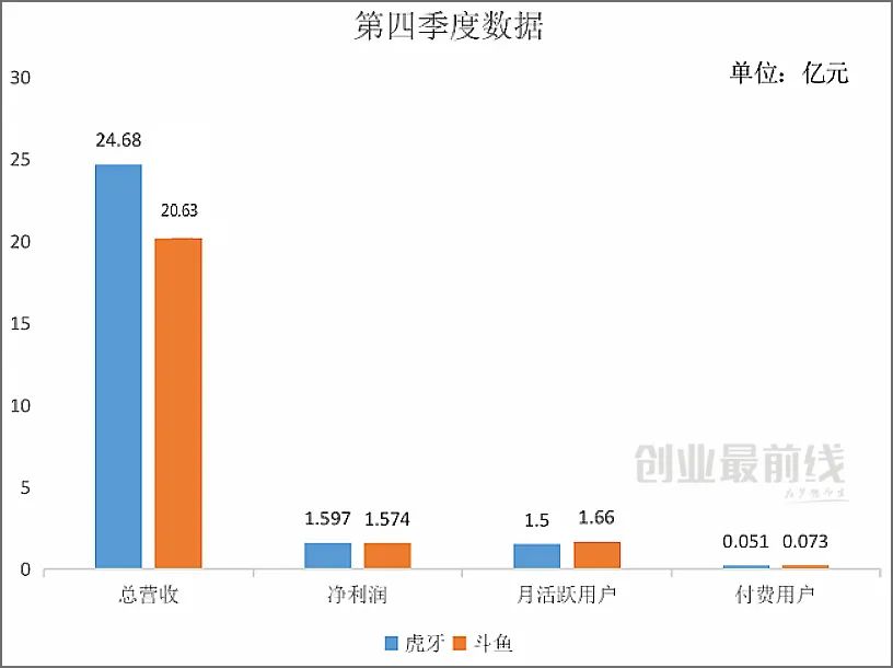 根据虎牙和斗鱼近期公布的2019年第四季度财报数据,两者的总营收分别为24.68亿元和20.63亿元,净利润分别为1.597亿元和1.574亿元,在月活跃用户和付费用户方面,两者的数据分别是1.50亿、1.66亿和510万、730万。