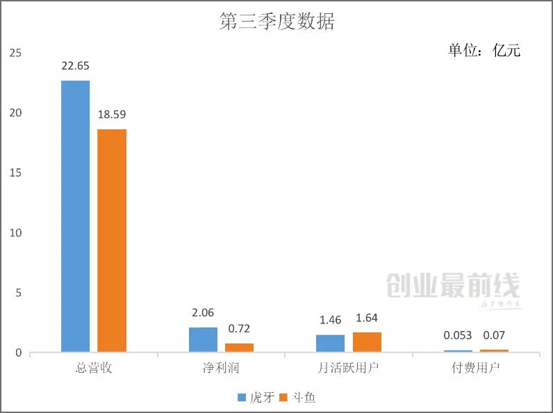 在2019年第三季度,虎牙和斗鱼的总营收分别为22.65亿元和18.59亿元,净利润分别为2.06亿元和0.72亿元,月活跃用户和付费用户分别为1.46亿、1.64亿和530万、700万。