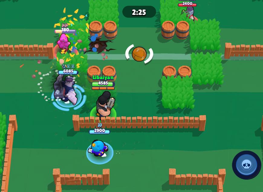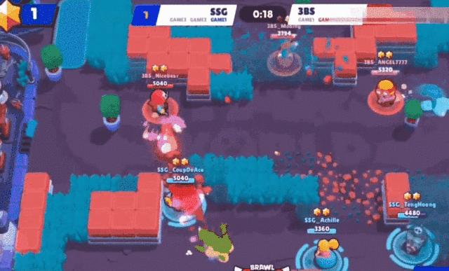 这就让《荒野乱斗》的战斗非常像是“击剑”。因为伤害太高,双方交战前会有很长的互相试探时间。但是一旦围绕地图机制开打,往往非常短的时间内对决就结束了,加上大招造成的伤害会给大招重复充能,团战场面会非常激烈。