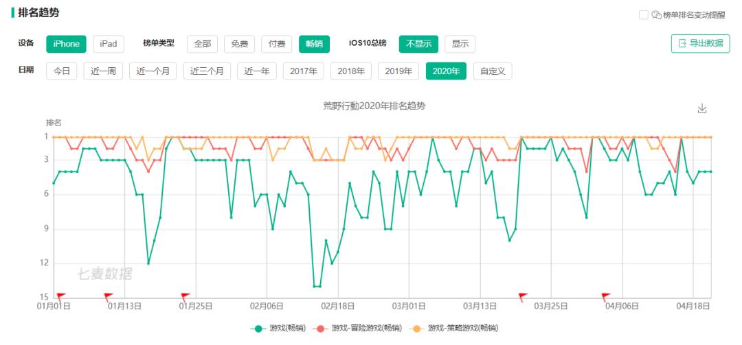 2020年《荒野行动》稳居日本游戏畅销榜前列/图截自七麦数据