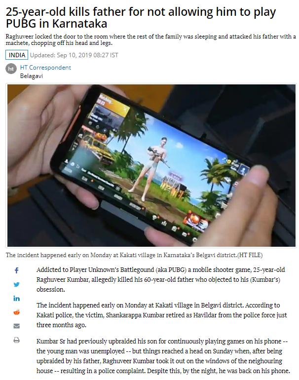 在此后的一年时间内,印度所发生的一系列负面事件,再度将公众情绪对准了这款手游。在印度的卡纳塔克邦,一位25岁的青年因为父亲阻拦他玩《PUBG Mobile》,一怒之下将父亲杀害了;一位健身教练连“肝”10天游戏,结果因体力不支被送去了医院。