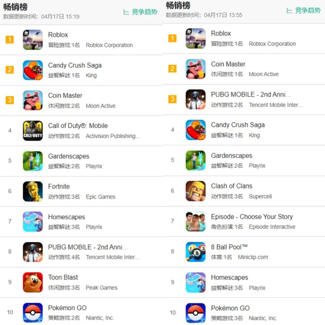 左为美国游戏畅销榜,右为英国,两者高度相似/截自七麦数据