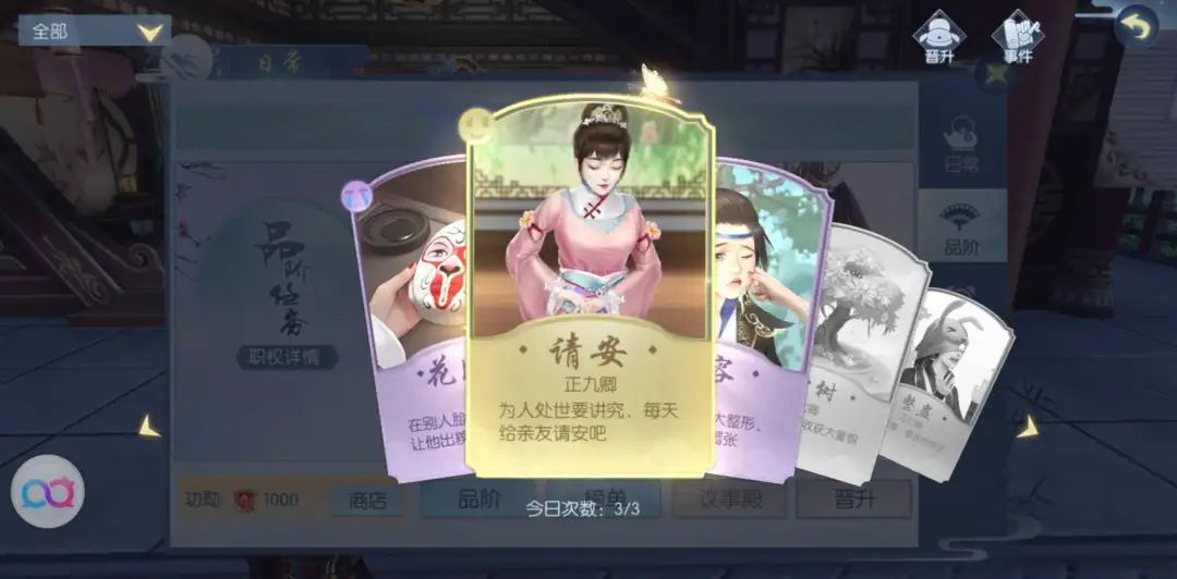 《熹妃传》一开始较为单调的战斗和换装升级品阶机制,到《浮生为卿歌》里,品阶考试已经有了较大的进步,不仅形式更为多样,有知识问答、连线、解密、换装、战斗等玩法,并且为了渲染氛围、增强代入感,这些考试题目与游戏题材的关联度也有了进一步的提升。