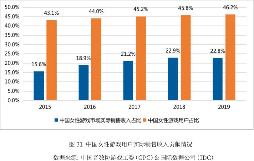 虽然前面的报告显示国内女性玩家的人数占比已经到达46.2%,同时某些游戏也证明了女性玩家的消费力,但该报告也指出,2019年女性用户贡献的实际市场销售收入占比只有22.8%,不足整体游戏市场收入的四分之一。