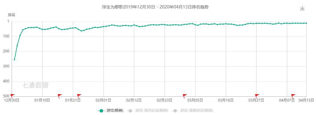但是在上线近一个月后,《浮生为卿歌》却开始发力,并且以大概每月上升10名的速度,在畅销排名上一路稳步前进,最终在4月7号闯入Top 10。这个成绩,说明该作得到了市场的认可。
