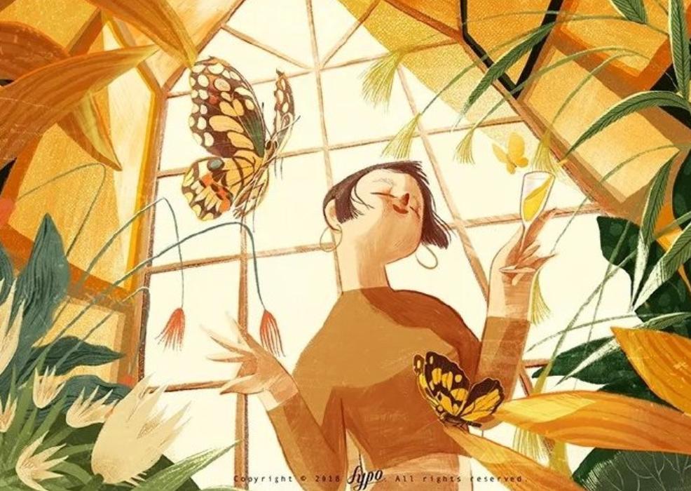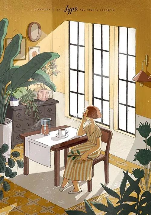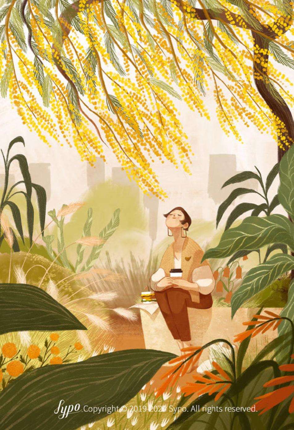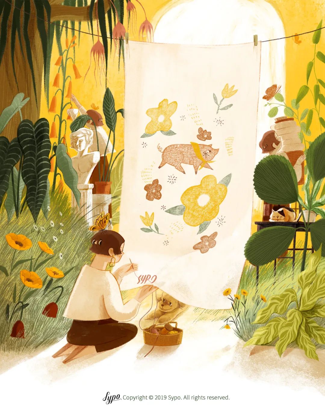 “我很喜欢植物,也很向往田园,所以会把这些作为固定元素。后来用黄色调是因为它是唯一一个我画不腻的颜色。我也想过我为什么这么喜欢用黄色,想起我以前有过一段很抑郁的状态,因为家庭和感情的一些原因,那时候总是很低沉,黄色是能够治愈我的颜色。”