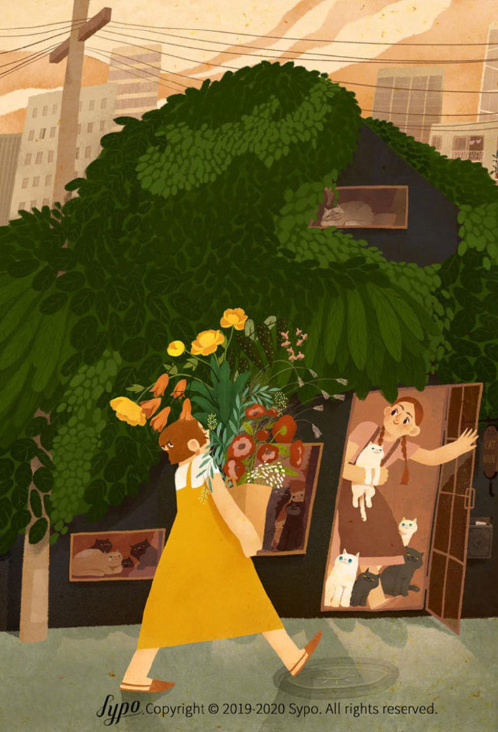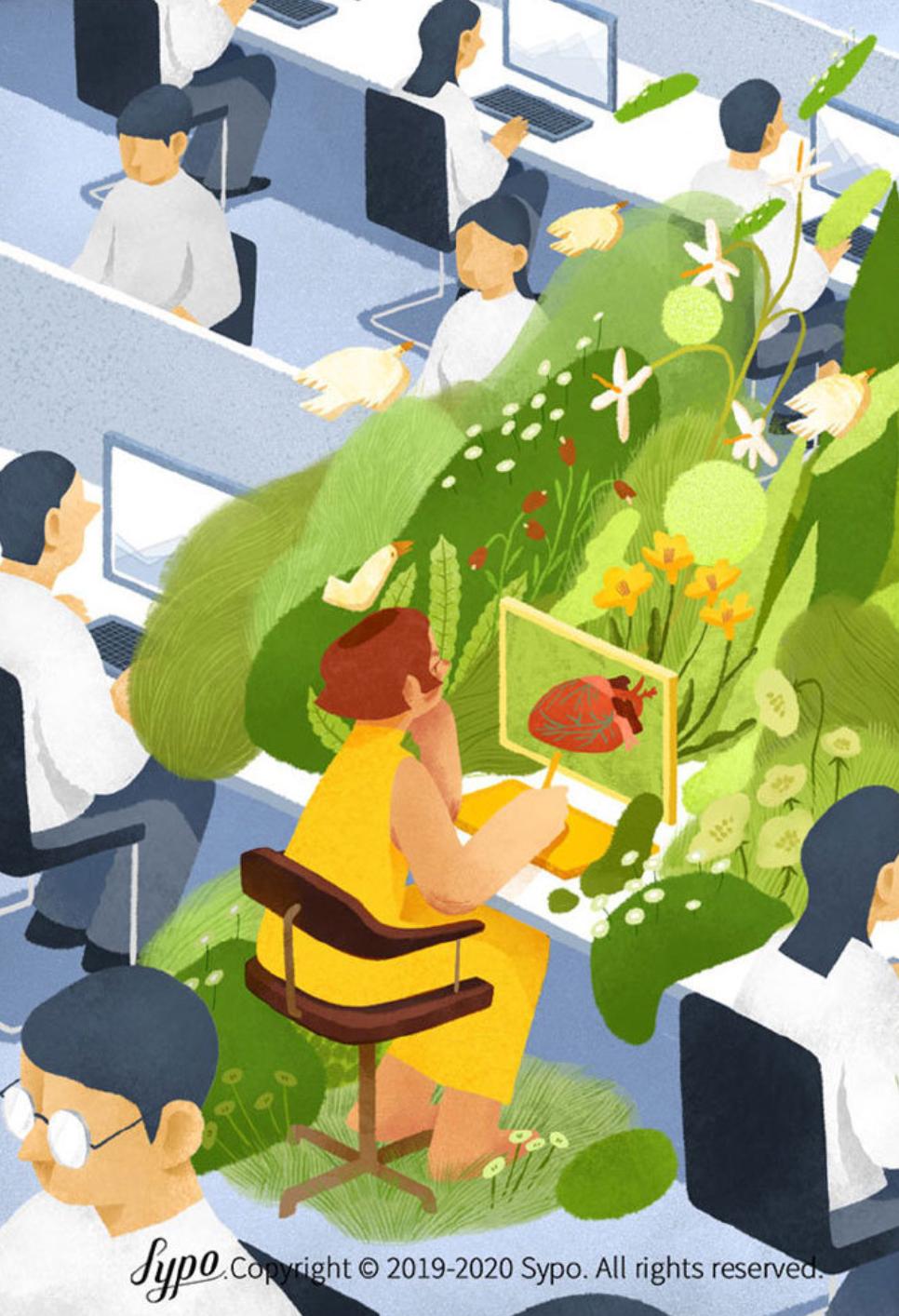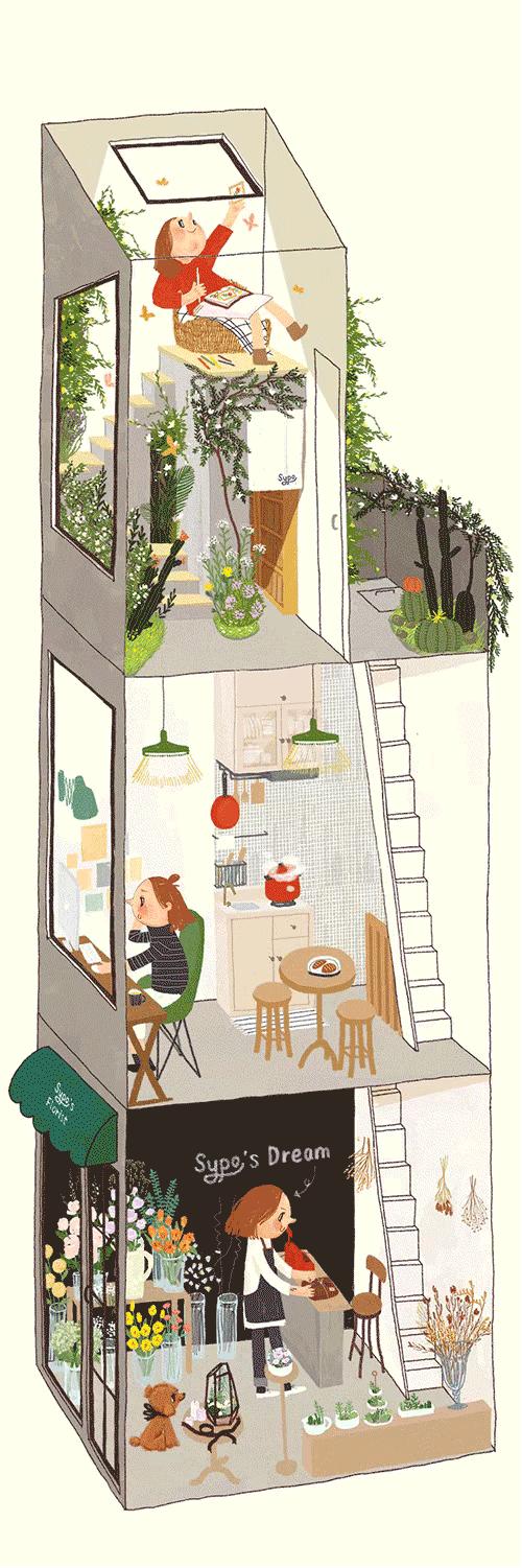 在还是一名上班族时,西朴就梦想将来能有一间属于自己的工作室。她理想中的办公环境应该被绿植包围,就像她的这幅画一样: