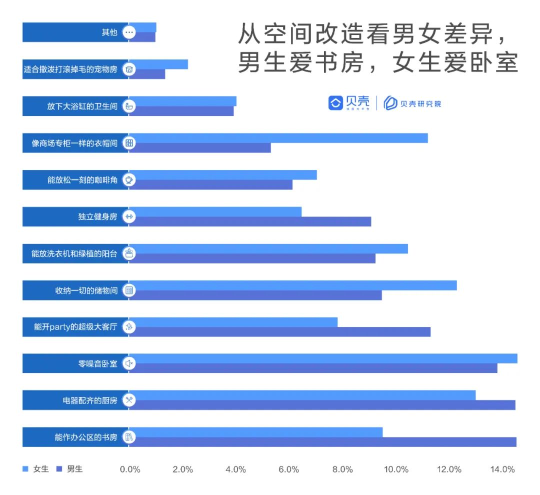 《报告》显示,男生更在乎书房,女生更看重卧室。二者的改造都体现了对居室动静区设置的需求。眼下,不少人因为疫情在家办公,小孩的追逐打闹声、父母辅导孩子作业时的歇斯底里、电视和音乐声.....如果隔音效果不好,这种“声声入耳”的体验会让人抓狂崩溃。但如果房子的动静区设置合理,父母在客厅看电视、孩子在书房上网课,你在书房或卧室办公,彼此之间互不打扰,既可以提高效率,也有利于正常休息。