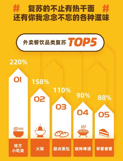 羊肉串、牛肉串、面包片、馒头片,烤腰子、烤茄子、烤韭菜、烤五花肉......“终于吃到心心念的烧烤了,真香!”全国复工复产后,以烧烤、火锅为首的大众喜爱的美食在餐饮外卖业务迎来爆发。美团外卖数据显示,全国外卖单量增长最高的五大餐饮品类,分别为地方小吃类 、火锅、甜点面包、烧烤啤酒、早餐套餐,这些品类的餐品都呈现90%至150%以上的幅度增长。其中牛肉串和烤茄子成烧烤外卖必点餐品,火锅外卖订单中金针菇和毛肚两种食材最受欢迎,一度在一些门店的外卖平台上脱销。