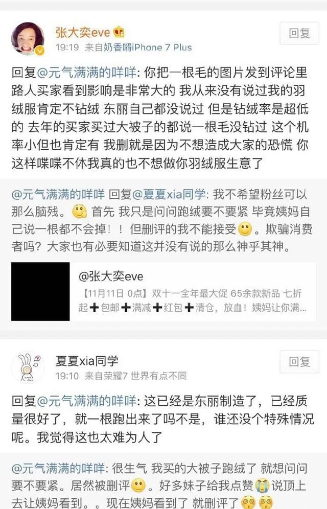 早在2016年,多名消费者在社交媒体上曝出张大奕上新的新品服装质量不佳,宣称“绝不钻毛”的羽绒服实际上“跑绒严重”。