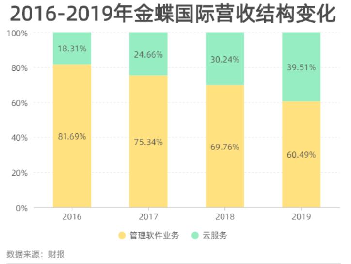 财报显示,金蝶国际的云服务收入占总营收的比重在持续升高,由2016年18.31%上升至2019年的39.51%。
