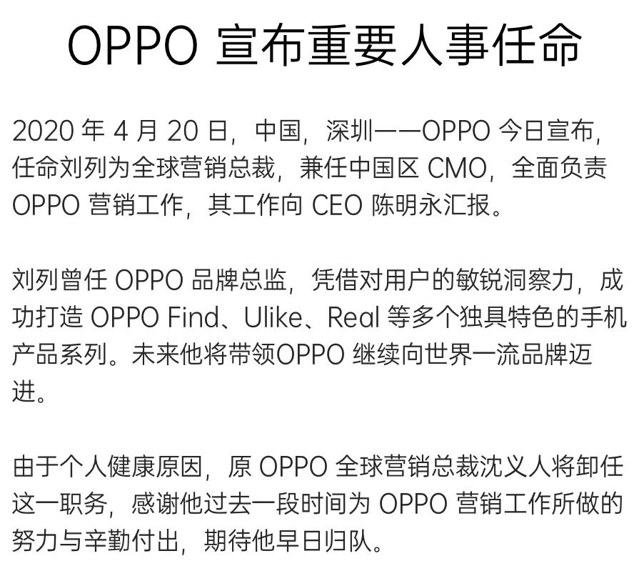 4月20日消息,OPPO宣布,公司全球营销总裁沈义人因个人健康原因将卸任。
