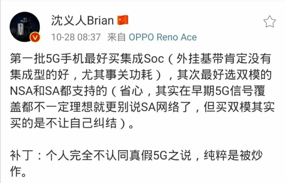 而沈义人在微博上表示,第一批5G手机最好买集成SoC的,即5G基带要和手机芯片合二为一,这样相比起外挂5G基带能有效降低功耗发热,对续航很有帮助。然而,一直采用高通骁龙处理器的OPPO,当时自身却没有一款5G双模手机。
