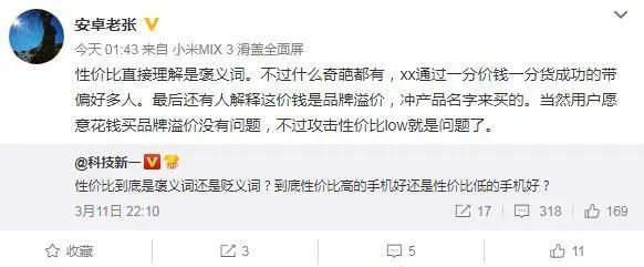 微博发出后,小米研发总监也下场回怼:“什么奇葩都有……用户愿意花钱买品牌溢价没有问题,不过攻击性价比Low就是问题了。”不少网友猜测,沈义人是为“现女友”OPPO推出全新产品线Reno的宣传造势。